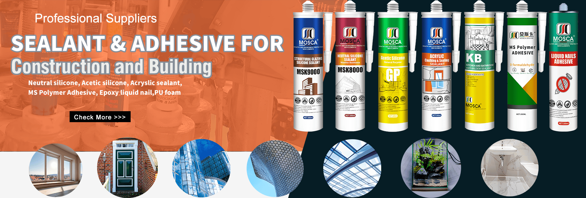 Foshan Mosca Silicone Industry Co.,Ltd is a professional manufacturer of all kinds of silicone sealant, PU sealant, MS sealant etc, mainly produces Structural adhesive, glass adhesive & sealant, foam glue, tile back adhesive, AB dry hanging adhesive, planting glue, sewing glue, electronic adhesive, automotive adhesive etc.