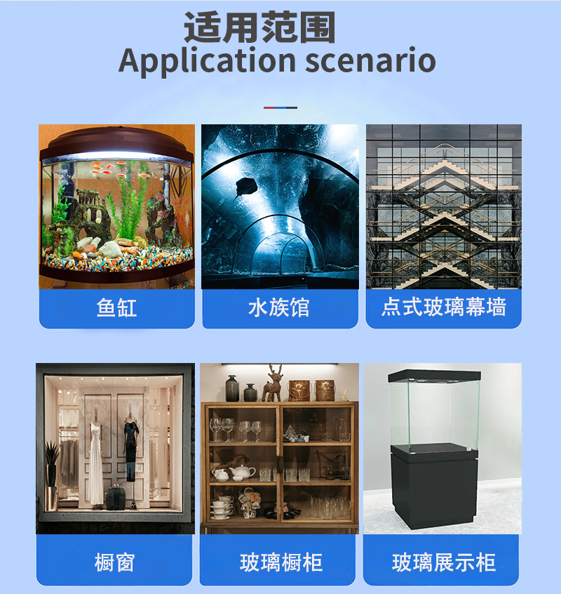 1.大平板玻璃、无镀膜玻璃、水族箱粘结密封;