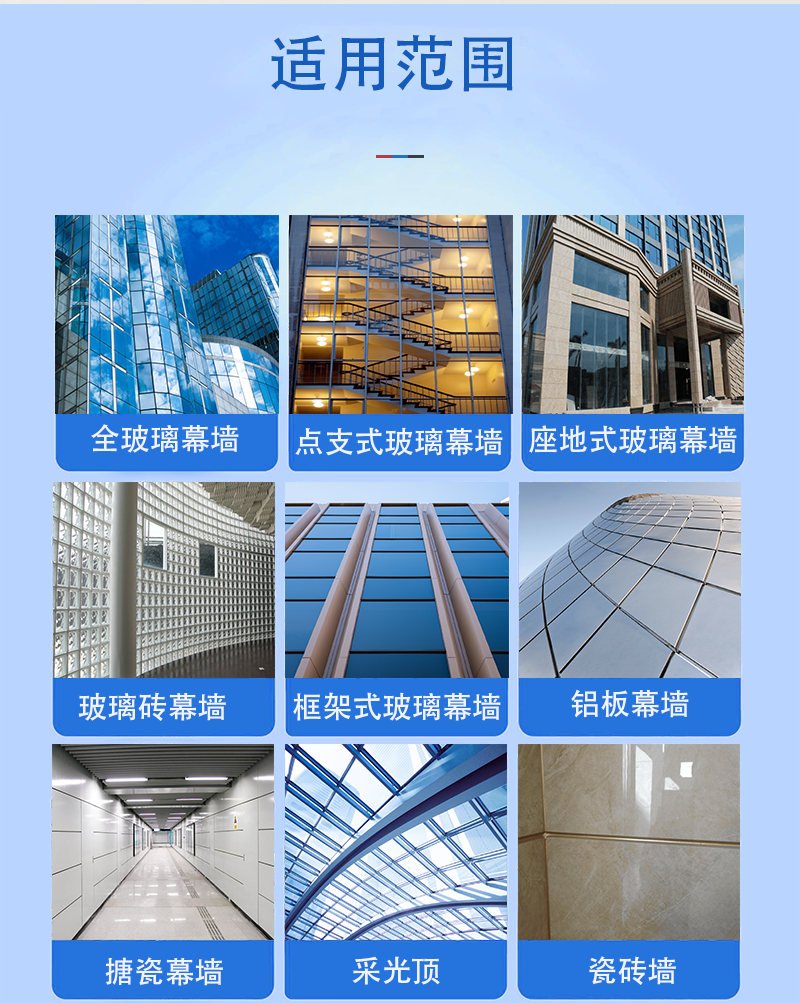 2.优异的抗位移能力,良好的耐高低温、耐气候老化、耐紫外线、耐臭氧性能,与大多数建筑材料有良好的粘接性能。