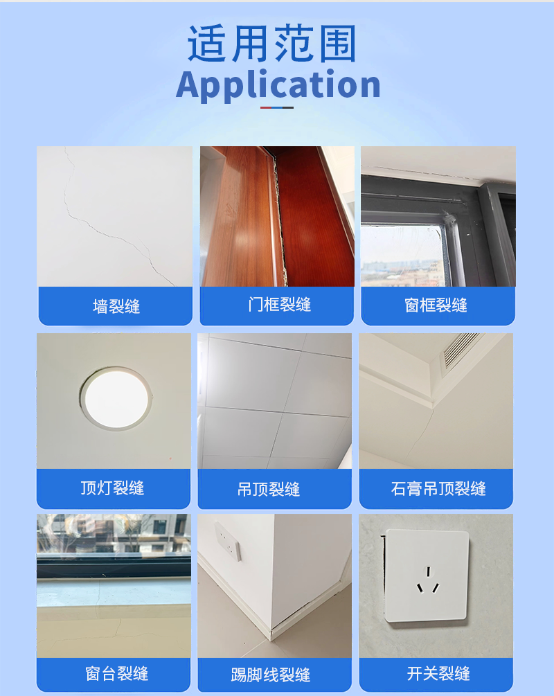 - 适用于室内装饰装修用大多数建筑材料,如铝型材、木材、石材、乳胶漆、墙纸墙布等的防水、密封、收边;