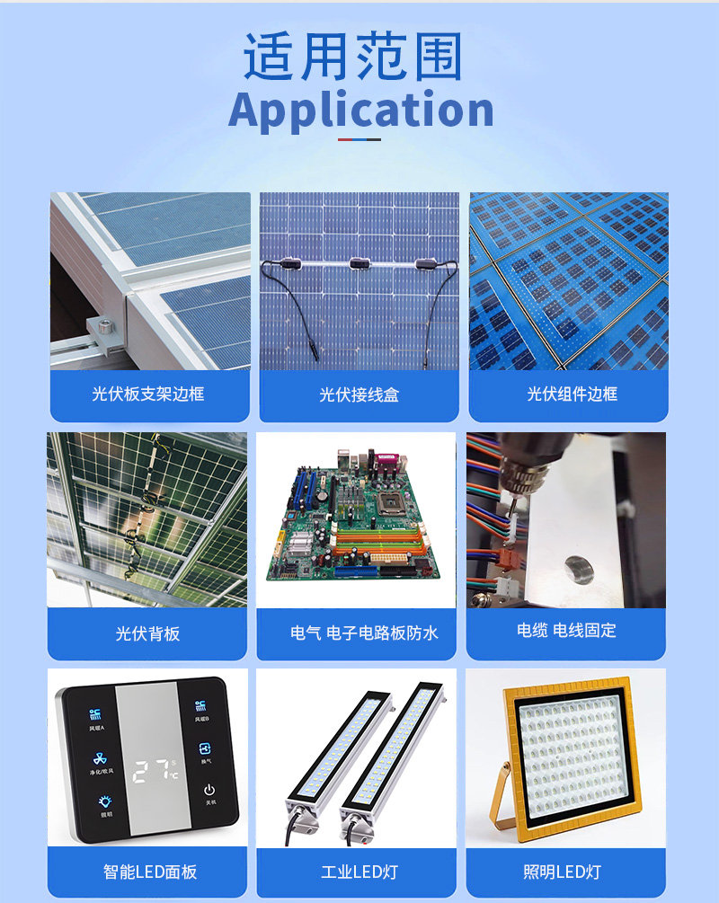 1.适用于太阳电池组件边框、支架边框(铝框)、背板(TPT 板)以及光伏接线盒(ABS)的粘结密封;