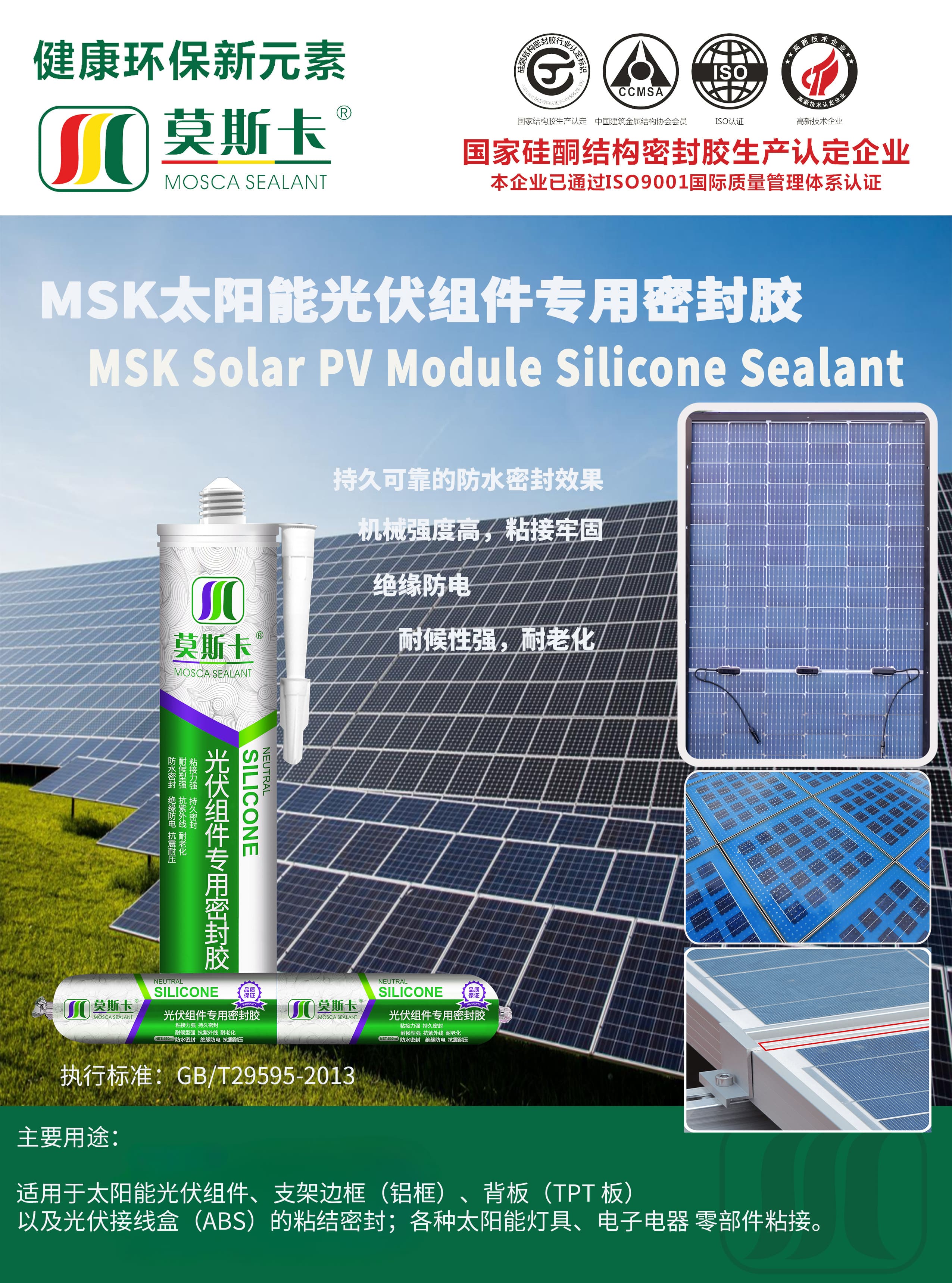 2.优异的粘结性能,对专用铝材,钢化玻璃,复合背材,接线盒PPO材料有良好的粘结性;